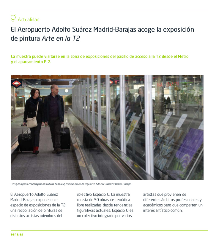 Durante este mes de febrero puedes contemplar en la T2 del Aeropuerto de Madrid la exposición "Arte en la T2" que el colectivo espacioU junto a artistas de Madrid Academía de Arte exponen 50 obras en este espacio reservado al Arte de la terminal del Aeropuerto de Madrid-Barajas Adolfo Suárez. Ver nota de prensa Europapress