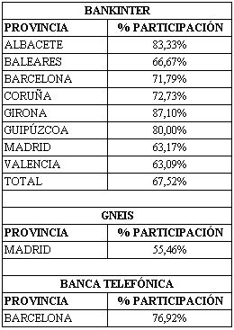 Y así, todos salimos ganando. Porque abrir la puerta a esta realidad y que Bankinter contribuya a ello, ha de ser el empujón definitivo para todas aquellas provincias y centros carentes aún de representación. Todos los compañeros que han votado, lo han hecho también por ti, (Asturias, Alicante, Canarias, Valladolid, Cádiz…) que no has podido votar. Tantos votos, y tanta participación son un grito de apoyo, una voz de ánimo, para que des el paso final, para que te atrevas a integrar un comité de empresa. Todos los compañeros que han votado (los porcentajes puedes verlos en el cuadro adjunto) te están apoyando, te están diciendo que tú también eres necesario, que tú también tienes algo que decir, que tú también tienes que votar.