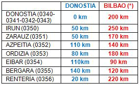 En la segunda aparecen de forma numérica las oficinas atendidas en ese periodo. Para la tercera columna se aplica el importe estipulado (0,29€/km.) al total de kilómetros efectuados, tomando como punto de partida San Sebastián; y finalmente en la cuarta columna se aplica el mismo criterio, pero tomando como punto de partida Bilbao.