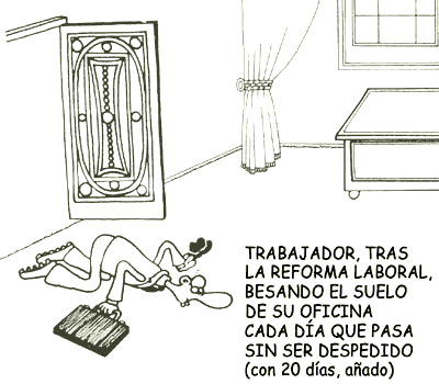 El otro día dijeron en las noticias que gente que se había quedado sin trabajo en Sevilla, (de unos 60 años), estaban haciendo de gorrillas, aparcando coches porque no tenían nada y corrían el peligro de perder todo por lo que habían luchado, algunos ocultaban su cara por vergüenza, como si ellos tuviesen la culpa de encontrarse en esa situación. Eso no se puede consentir, lo vamos a notar con el paso del tiempo, poco a poco, primero unos y luego otros. Siento ser tan agorero, pero me da mucho miedo esta reforma laboral que ha impuesto ZP. Me ha defraudado enormemente, la crisis económica la han provocado otros y la pagamos los trabajadores siempre, más aún si tragamos. Tenemos que poner todos de nuestra parte para defendernos. Esto se puede cambiar si protestamos masivamente e insistimos las veces que haga falta.