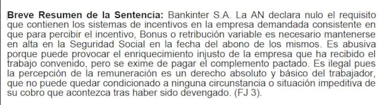 Parece lógico lo que argumentamos ¿no? Pues la empresa nunca nos dio la razón. Afortunadamente, ahora ha sido un juez el que nos la ha dado y condena a Bankinter SA a eliminar esa cláusula de sus sistemas de incentivos... esperemos que extienda este requerimiento al resto de empresas del Grupo.