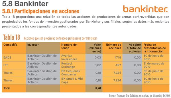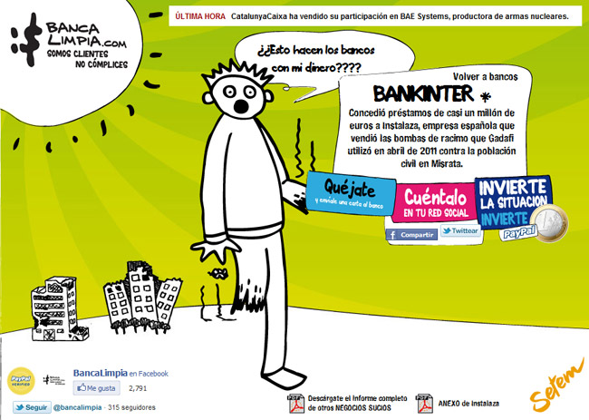Banca Limpia publicó el informe “negocios sucios, bancos españoles que financian armas” en el que destaca Bankinter como prestamista de un millón de euros a la empresa Instalaza que fabricó las bombas de racimo que Gadafi utilizó en abril contra la población civil en Misrata.
