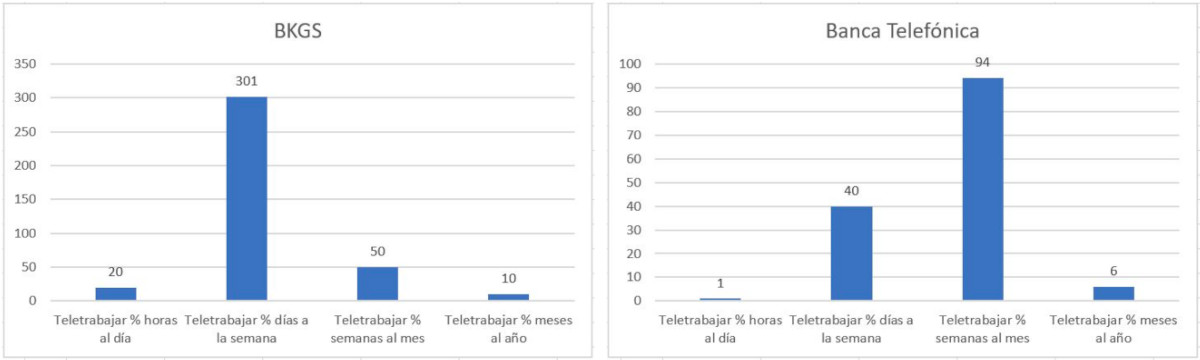 En cuanto a la organización del TT, hay dos bloques que destacan sobre los demás, pero que son diferentes en ambas empresas. Mientras BKGS apuesta por un % de días a la semana, Banca Telefónica prefiere hacer la distribución por semanas dentro del mes.